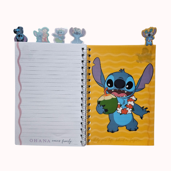 📘 Espiral metálico, tapa dura y separadores con imagenes de Stitch, Lilo y compañía que le dan un toque único a cada sección. Además, tiene un práctico estuche lateral con cierre, ideal para guardar lapiceras, stickers o secretos creativos.