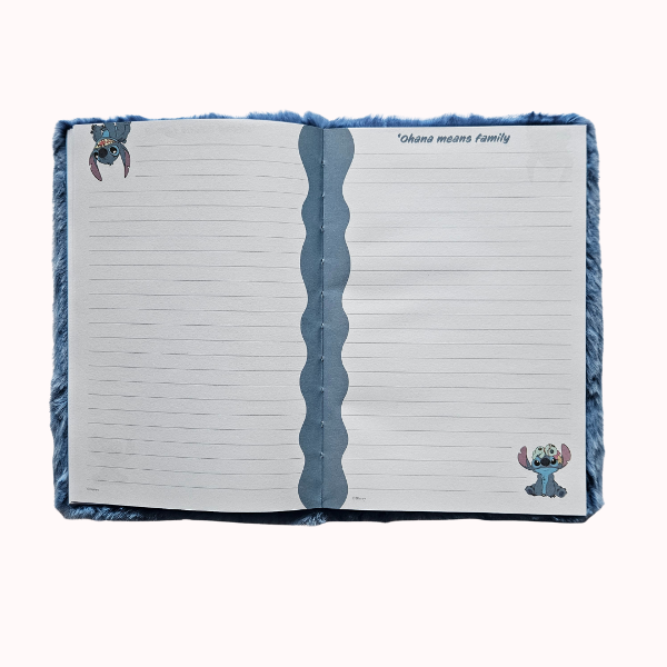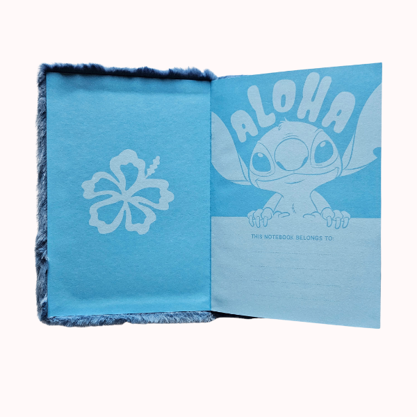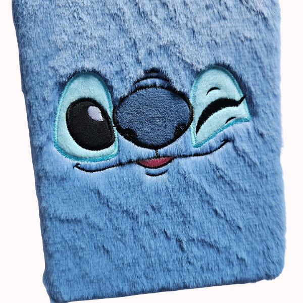 🐾 Tapa dura forrada en suave peluche con el carismático guiño de Stitch, ¡pura ternura para tus manos!